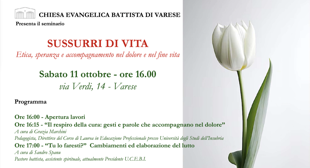 La Chiesa Evangelica Battista di Varese invita la cittadinanza al seminario “Sussurri di vita. Etica, speranza e accompagnamento nel dolore e nel fine vita”, che si terrà sabato 11 ottobre alle ore 16 presso la sede della chiesa, in via Verdi 14, Varese.