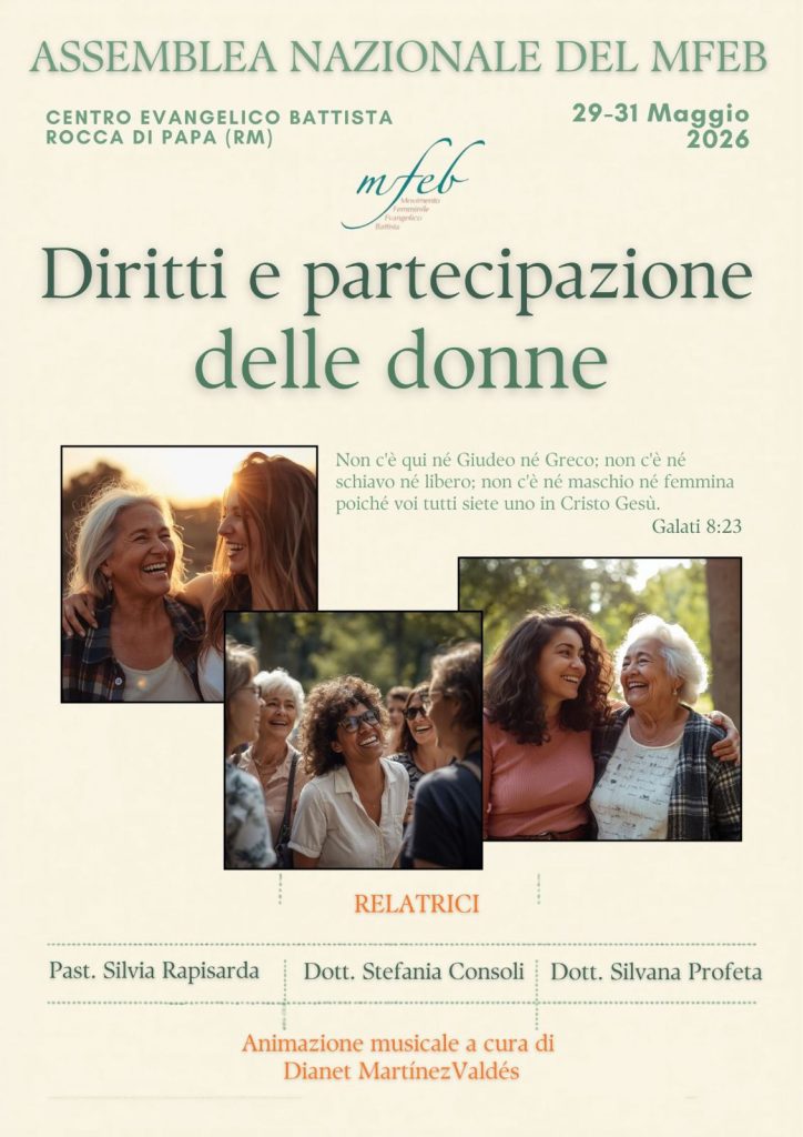 Dal 29 al 31 maggio 2026 si terrà, presso il Centro Evangelico Battista di Rocca di Papa (RM), l’Assemblea Nazionale del Movimento Femminile Evangelico Battista (MFEB), un appuntamento atteso e significativo per la vita delle chiese battiste in Italia.